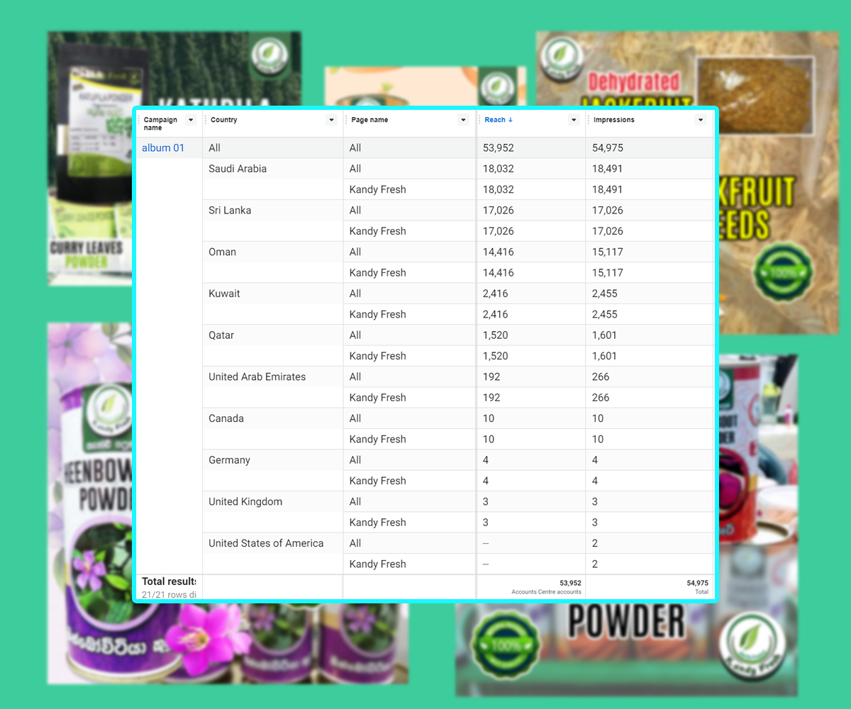We had the pleasure of working with Kandy Fresh, a dehydrated food business, on a global scale. Our Facebook ad campaigns not only targeted customers in Sri Lanka but also reached audiences worldwide, particularly in Europe, the Middle East, and the USA. In addition to managing the ad campaigns, we also designed eye-catching and engaging posts to complement the overall marketing strategy. Our team crafted visually appealing designs that effectively communicated the essence of Kandy Fresh’s dehydrated food products. By combining our expertise in Facebook advertising and post design, we were able to capture the attention of the target audience, drive brand awareness, and generate increased sales for Kandy Fresh across various international markets.